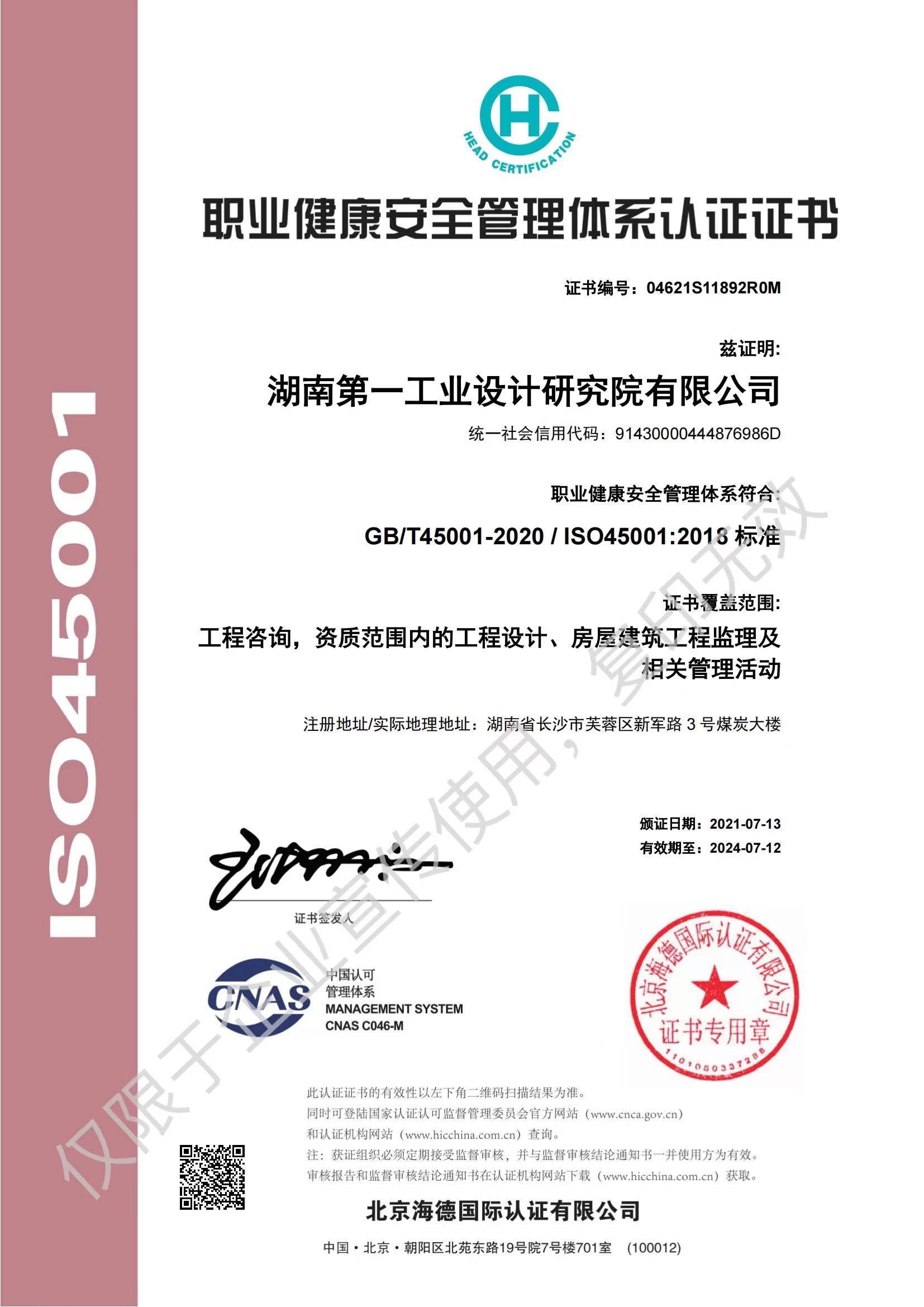 ISO45001職業(yè)健康管理體系認證證書…